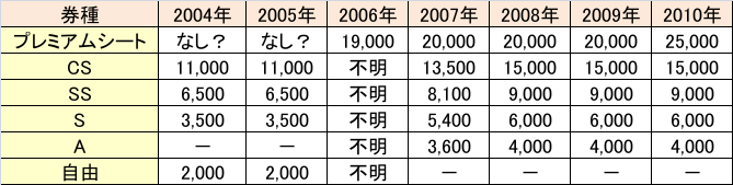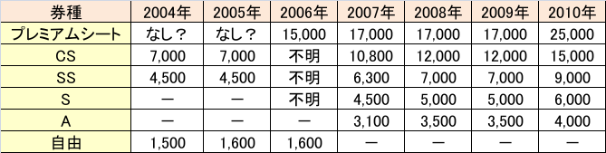 2004年当時と比べるとすごい変化です。自由席と金曜日のSS席はなんと2倍の値段になっています。