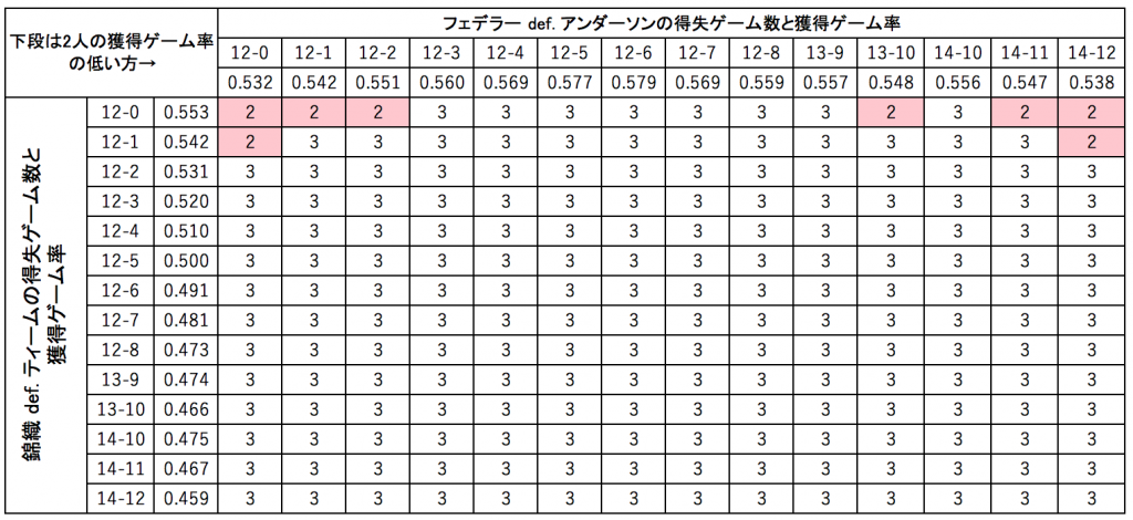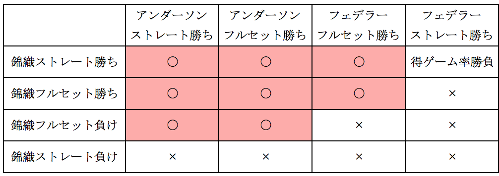 フェデラーの調子が復活してストレート勝ちし、この表が適用される状況になれば非常に厳しい状況になることが分かります。