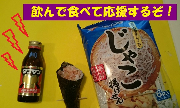 応援フード、ジャコ入りノリ巻きおにぎり食べて、勝破えびせんと甘栗(勝ち栗)も継続して食べました。