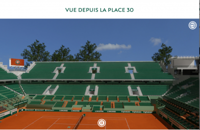 席を選ぶときに、座席のグラフィックから直接選ぶことができます。これは分かりやすい。そして何と、「その席から見たコートの眺め」をCGでチェックできるのです!!! こんな感じです!! これは、6/6のシャトリエの私の席。遠いw