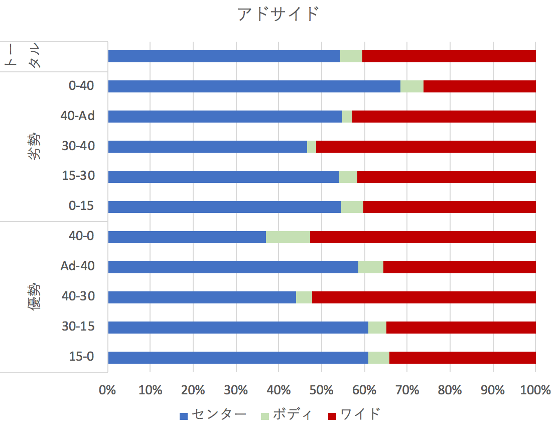- ポイント毎の傾向はバラバラ。15-15のワイド、30-30のセンターが多いのが気になるが、何かの意図があるかどうかは不明。