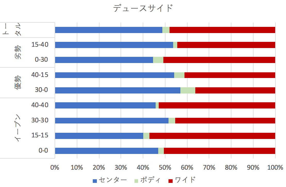- デュースサイドは半々打ち分け、アドサイドはセンター多め。