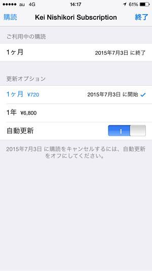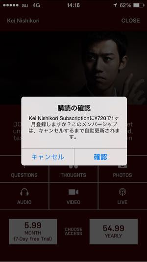 ドル表記ですが、決済時に1か月720円、1年6,800円と表示されます。7日間は無料トライアルが可能らしいけど、設定を変えないと自動更新されてしまうので注意。また、無料トライアルだけで解約する方法は分かりませんでした。