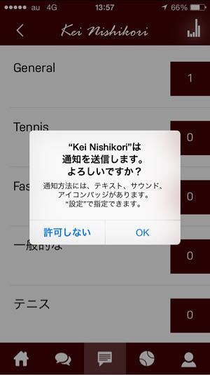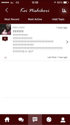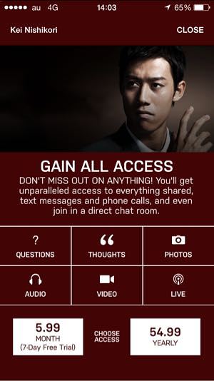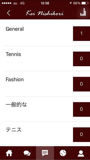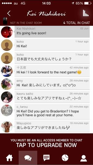 チャット画面。こちらは日本語入力OKの模様。ただし、入力するためには「TAP TO UPGRADE NOW」を押して、課金しないといけません。Kei is not in the chat roomとか書かれているので、錦織がINすれば本人とチャットできるかも?実はオリバーだったってオチじゃないことを祈りますがw
